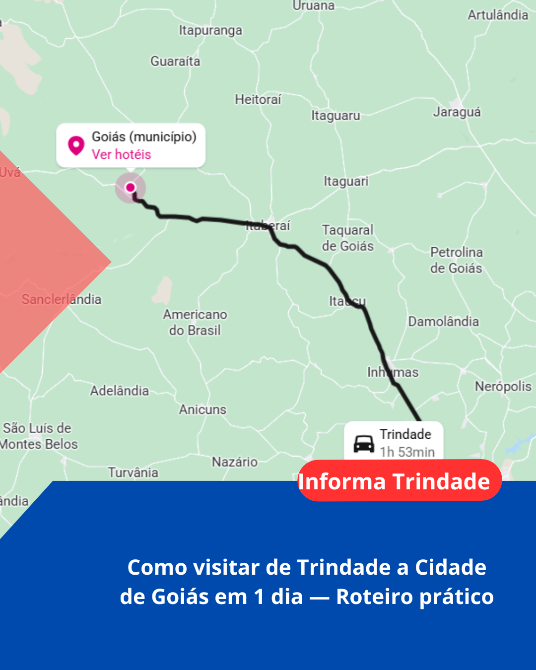 - Distância / tempo: Trindade → Cidade de Goiás ≈ 137 km — ~1h50–2h de carro, dependendo do trânsito. Planeje o retorno com folga.
